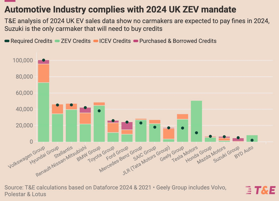 8 T&E, “Mission accomplished: Carmakers fulfill the 2024 ZEV mandate”, 21 January 2025. Retrieved on 19 September 2025 from https://www.transportenvironment.org/te-united-kingdom/articles/mission-accomplished-carmakers-fulfill-the-2024-zev-mandate